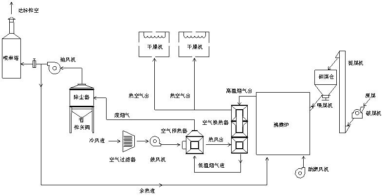 經過項目小組的討論與研究,本系統采用了沸騰爐、列管式換熱器、多管+水膜除塵等工藝組成,沸騰爐采用流化床燃燒技術,燃料適應性廣,能燃用熱值低于3000kcal/kg的各種煤,且供熱溫度溫度可調,調溫迅速,燃燼率高達99%;列管式換熱器高溫段采用耐熱不銹鋼材質,并設計獨特的梅花狀噴流管結構,能有效提升換熱效率,合理的管束排列,能控制煙氣流速穩定在10m/s,可避免管子積灰;除塵系統為干法+濕法方案,即廢煙氣先經過多管多除塵器,該除塵器由多個陶瓷旋風子組成,除塵效率可達95%以上,風阻小于900Pa,運行成本低;再進入水膜除塵塔,可對廢氣進一步凈化,加入脫硫劑,可對煙氣進行脫硫。